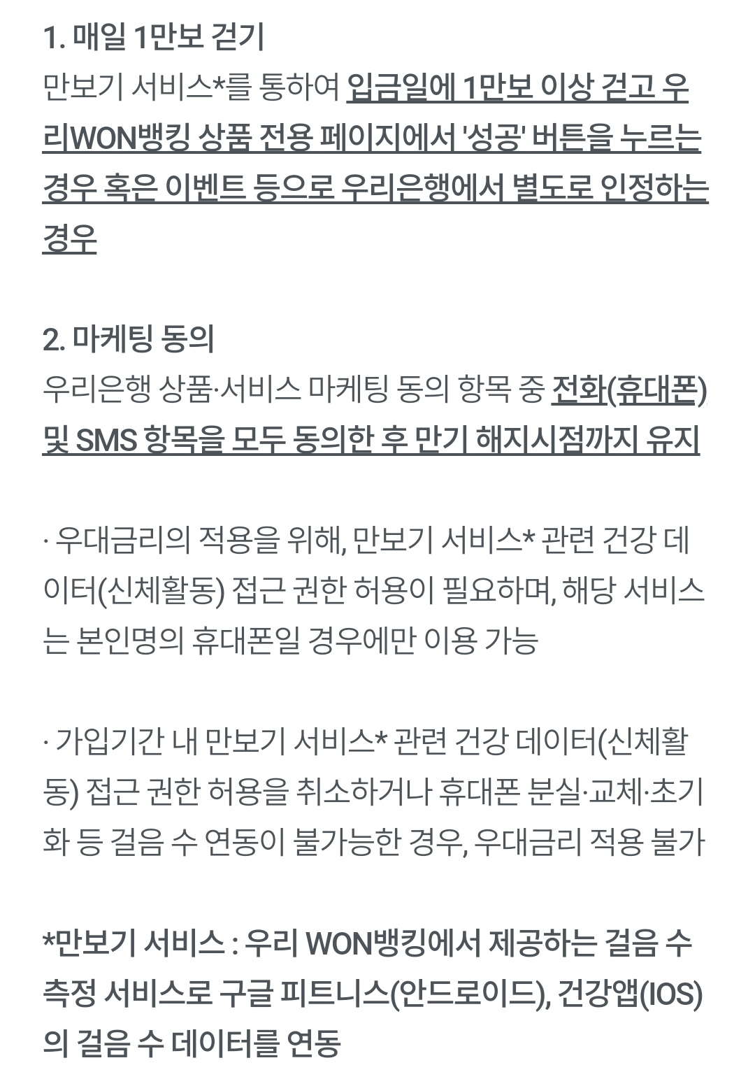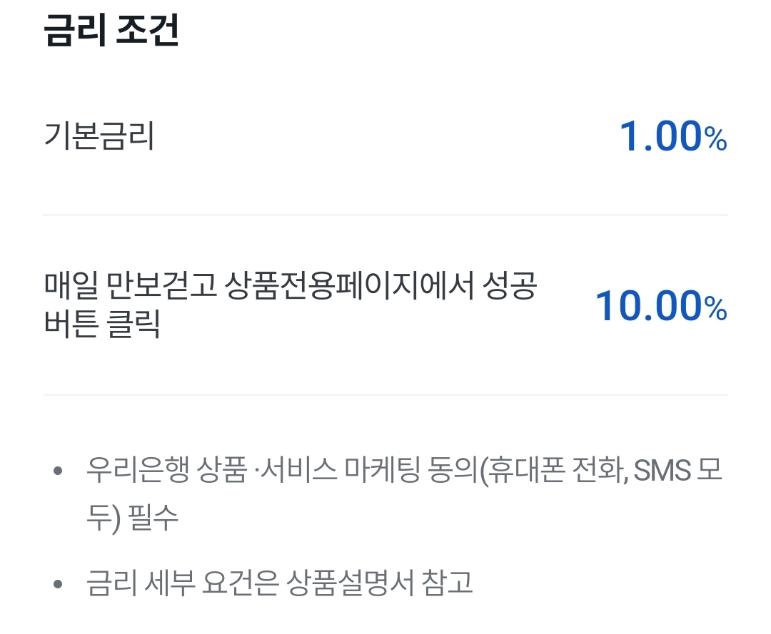ㅡ 구글 피트니스(아이폰은 건강앱)와 연동해 1만 보 이상 걷고 우리은행앱을 열어 해당 페이지에서 "성공"을 누르면 그날의 입금액은 우대금리 +10%를 적용해 11% 이율 적용.