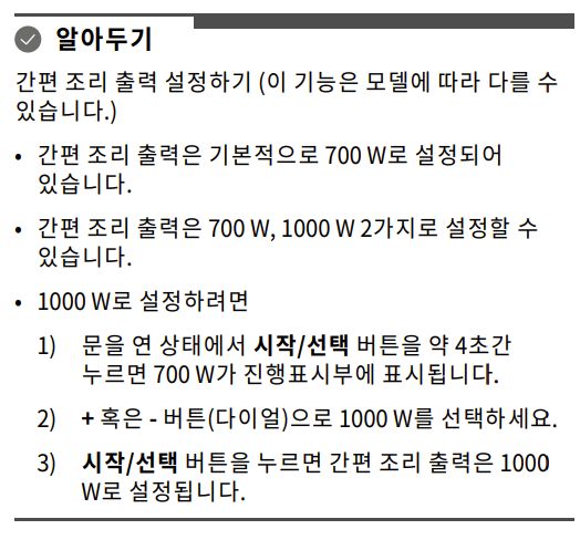 (아니면 그냥 전자레인지 본체 어디에 붙일 수 있도록 기능설명을 코팅지 카드로 제공해도 나쁘지 않을 것 같다. 기능설명 글씨가 좀 작다)