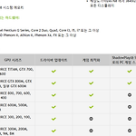 통합 드라이버 패키지를 다운로드받아 설치할 때 전체설치하면 깔리는 프로그램. 게임 최적화, 녹화, 스트리밍 등. 게임최적화는 당연히 구버전 카드와 시스템에서도 되고녹화와 스트리밍은 시스템 사양과 그래픽카드 제약이 있다. ( 전체사양보기 ) 섀도우플레이와 쉴드 스트리밍은 i3 이상부터 쓰기를 권장. 하스웰 펜티엄 G정도면 가능하지 싶다. 하지만 게임과 별개로 CPU자원을 먹기 때문에 아무래도 스레드가 2개면 G3258같이 오버클럭이 되더라도 어떨 지는 해봐야 알 것 같다. 설치 및 설정 화면 최적화할 게임 고르기. 하단에 "인증되지 않은 게임 복제본은 지원되지 않음"이라는 구절이 보인다.처음 깔아서 아직 보이는 게 없음. 대항온과 마비노기는 아닌 모양. 장치 탭. 섀도우플레이.녹화 및 마이크, 녹화영역, ..